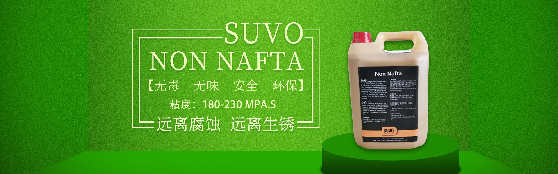 SUVO Non Nafta 是一款無毒、無味、安全、環保的油基/蠟基防銹產品,不含溶劑,內含超強的防腐劑。 涂刷本產品后,會在被保護的工件表面形成一層80-100微米厚的油脂、蠟基保護膜,保護金屬產品免受惡劣環境侵害,遠離腐蝕,遠離生銹。 產品適合于鋼鐵制品在陸地存儲或海上運輸過程中的長期防腐,防銹。本產品非常易于被石油精/煤油清洗劑清除,清洗過程不損傷工件表面,不污染施工環境。
